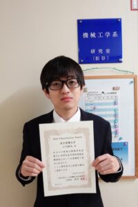 機械要素研究室(松谷研究室)所属の大野元輝さんの論文「粘性流体を用いた外乱振動を低減する光学式傾斜計の開発」が、日本機械学会関東支部第64回学生員卒業研究発表会においてBest Presentation Awardを受賞しました。